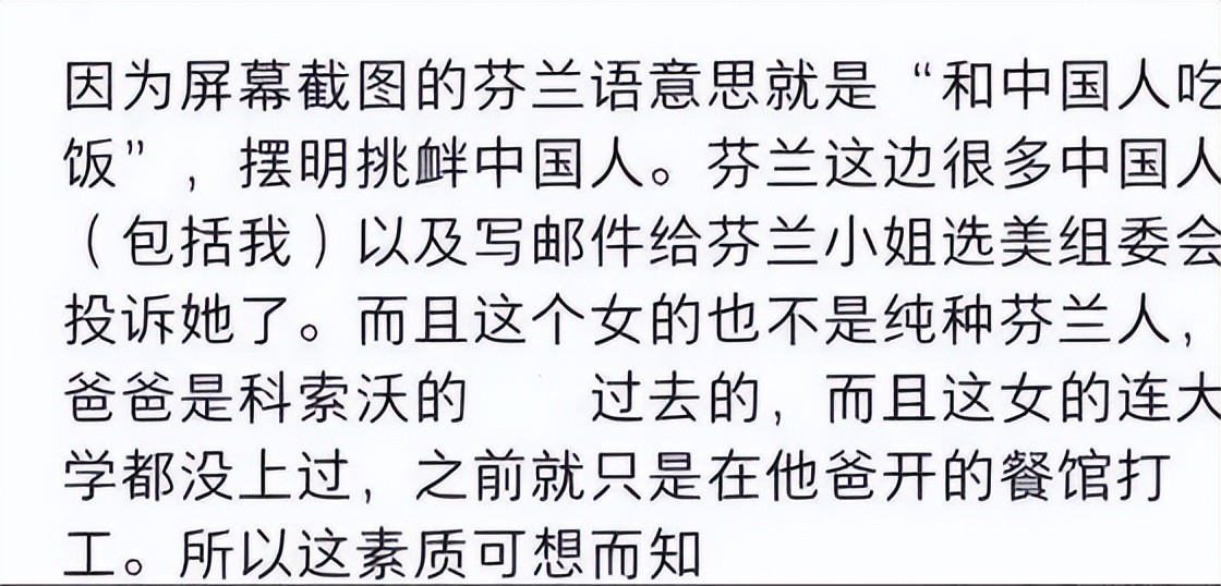 更别提她还顶着“芬兰小姐”的头衔——这头衔可不是单纯的颜值认证,本质是代表国家的文化名片啊,她这波操作,既冒犯了华人,又丢了芬兰的脸面。